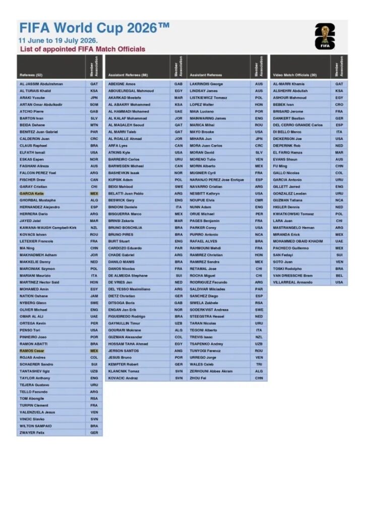 La FIFA anunció la lista de silbantes para la Copa del Mundo 2026, destacando la inclusión de los mexicanos César Arturo Ramos Palazuelos y Katia Itzel García, quienes formarán parte del grupo que impartirá justicia en el torneo más grande en la historia del futbol.