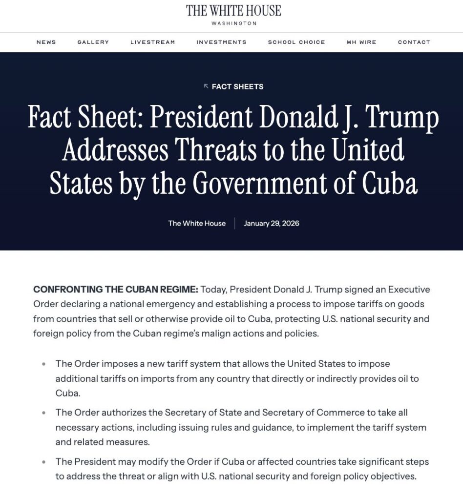 Estados Unidos anunció la imposición de aranceles adicionales a las importaciones procedentes de países que comercialicen petróleo con Cuba, como parte de un endurecimiento de su política hacia la isla. La medida, firmada por el presidente Donald Trump mediante una orden ejecutiva, se sustenta en la declaración de una emergencia nacional, al considerar que la relación de Cuba con actores como Rusia, China, Irán y grupos extremistas representa una amenaza para la seguridad estadounidense.