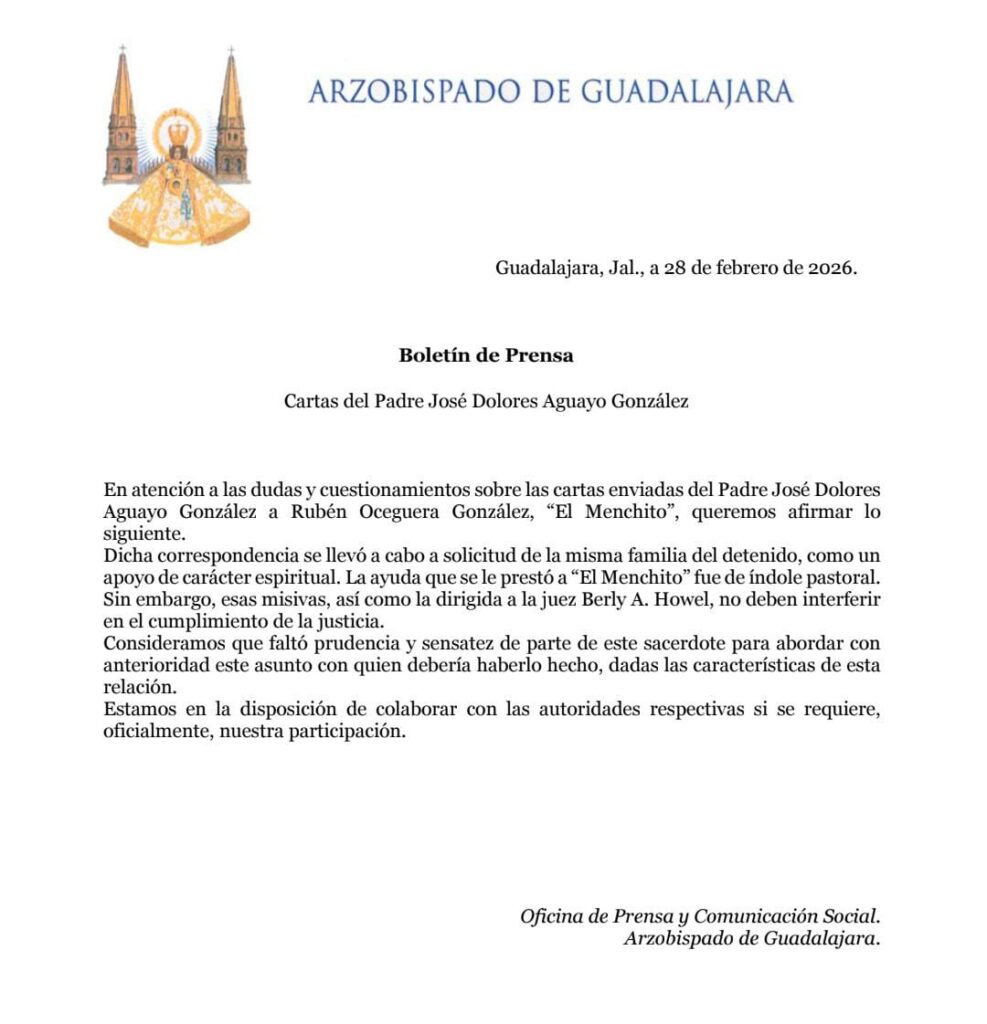En un boletín fechado el 28 de febrero de 2026, la autoridad eclesiástica confirmó la autenticidad de las misivas, incluidas aquellas dirigidas a la jueza federal Beryl A. Howell. Aclaró que fueron enviadas a petición de la familia Oseguera y que el acompañamiento fue estrictamente pastoral, sin intención de interferir en la justicia. No obstante, señaló que el sacerdote debió consultar previamente a instancias superiores antes de involucrarse.