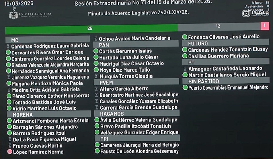 Al ser 38 los legisladores que conforman el Congreso de Jalisco, el umbral mínimo legal para dar validez al nombramiento es de 26 votos. Sin embargo, la declaratoria se realizó con apenas 24 votos a favor, uno nulo y uno para un perfil distinto, sumando una voluntad efectiva que queda por debajo de la mayoría calificada requerida por la ley.