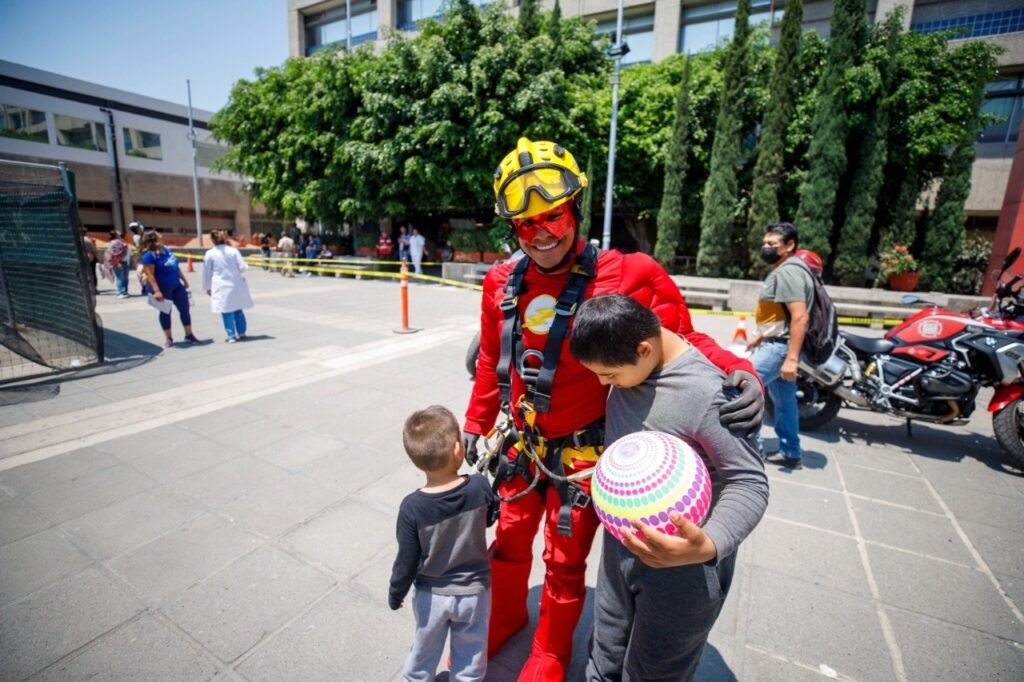 Elementos de la Coordinación Municipal de Protección Civil y Bomberos de Guadalajara cambiaron sus uniformes tácticos por capas y máscaras para celebrar de forma única el Día de la Niñez con los pequeños pacientes hospitalizados.
