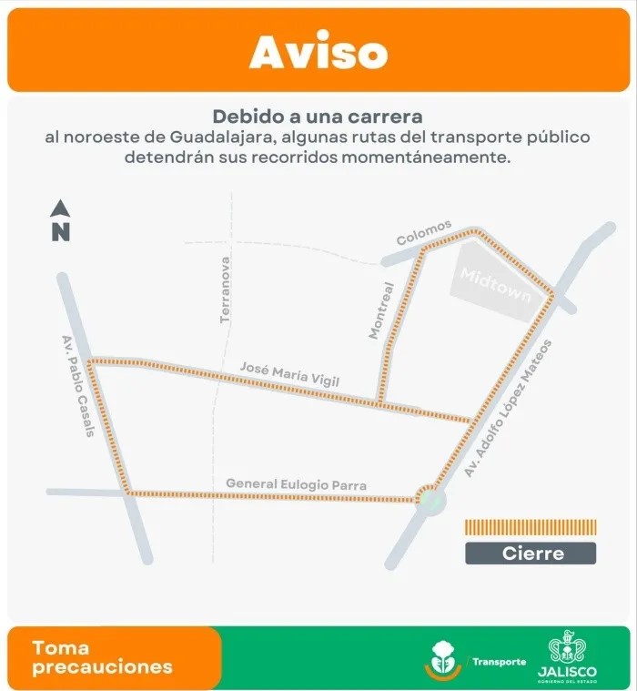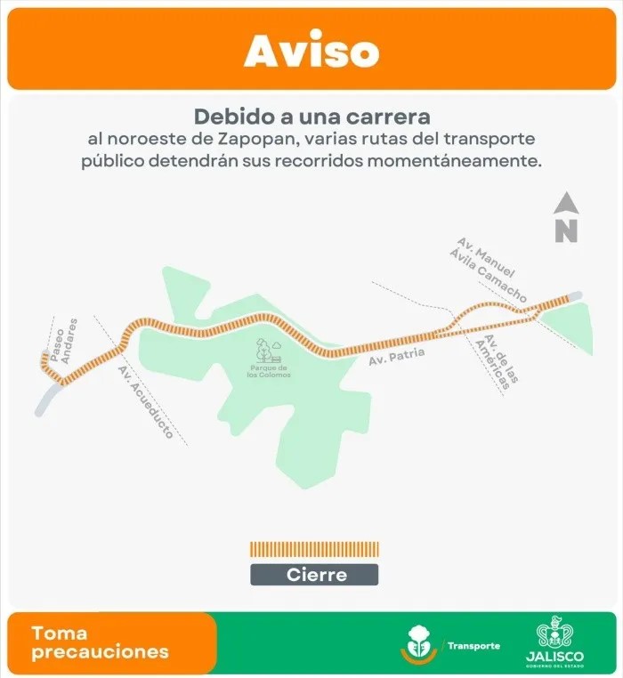 En Guadalajara se cerrarán Avenida de los Maestros y Sierra Nevada, mientras que en Zapopan estarán restringidas Avenida Patria y Paseo Andares. Varias rutas suspenderán servicio, entre ellas la C54, C119 Circuito y T18, mientras que otras, como la C23 y la C124, modificarán su recorrido.