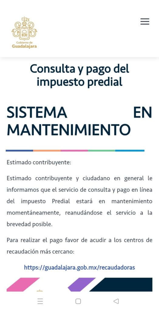 La falta de funcionamiento del sistema de pago en línea del impuesto predial del gobierno de Guadalajara ha generado inconformidad entre los contribuyentes, quienes señalan una deficiente gestión digital por parte de la administración municipal. Desde hace días, la página oficial presenta un aviso en el que se informa que el servicio se encuentra en “mantenimiento momentáneo”, sin que exista una fecha clara para su restablecimiento.