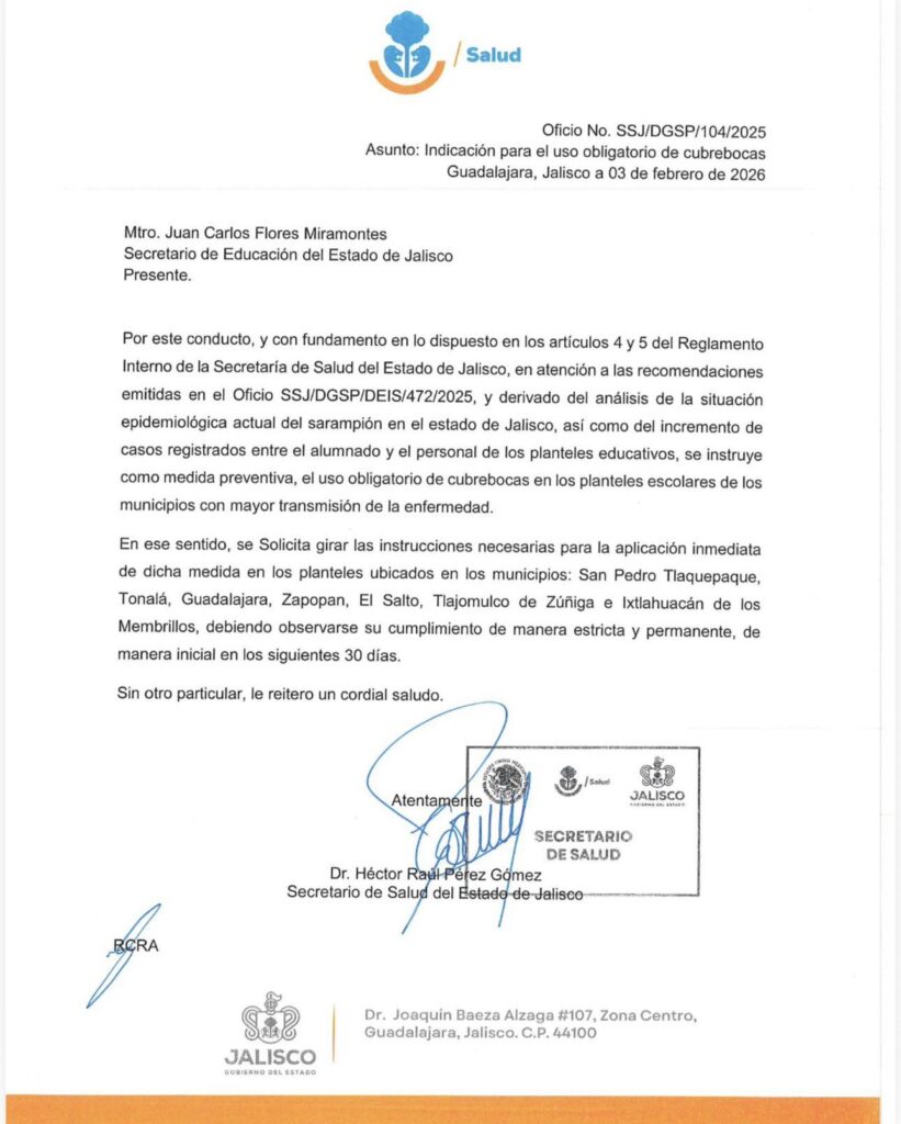 Las secretarías de Salud y Educación de Jalisco anunciaron que este jueves se reestablecerá el uso obligatorio de cubrebocas en los planteles educativos del estado, tras el aumento de casos de sarampión en la región metropolitana.