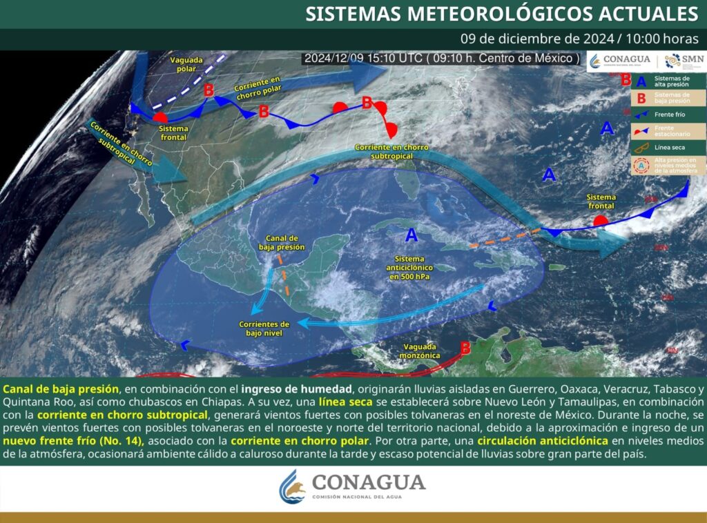 De acuerdo con el pronóstico, se prevén lluvias fuertes a muy fuertes, descenso drástico de temperatura y rachas de viento intensas. En el norte, los estados más afectados serán Baja California, Sonora, Chihuahua y Durango, donde los termómetros podrían caer hasta los –15 grados y registrarse nevadas en zonas serranas.