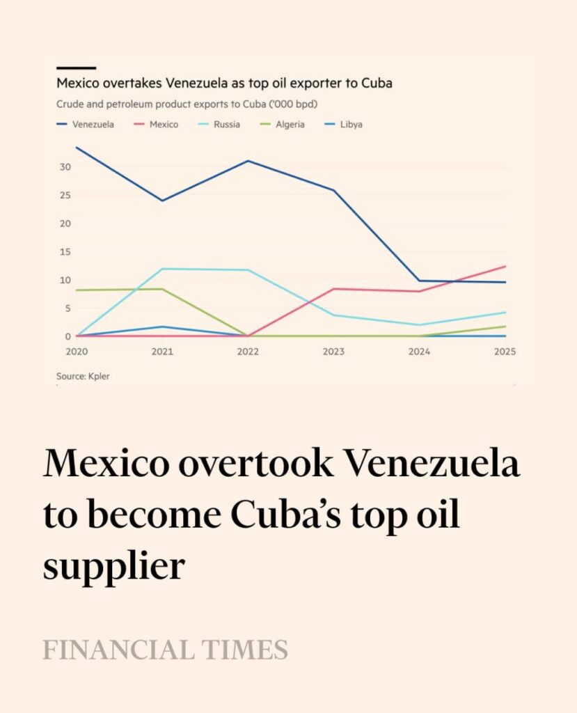 El contexto, sin embargo, es más complejo. De acuerdo con el Financial Times, México superó a Venezuela como principal proveedor de petróleo de Cuba en 2025, en un momento en que Estados Unidos endurece su discurso regional y reduce su dependencia del crudo latinoamericano. Entre 2012 y 2025, México y Venezuela pasaron a aportar apenas 2.4% del petróleo que consume la economía estadounidense, reflejo del auge del shale oil en EU y del deterioro de ambas petroleras estatales.